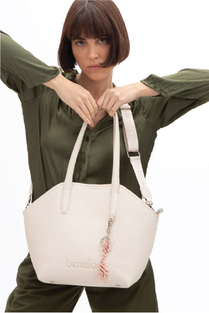 תיק אישה מדהים שכל אחת חייבת לעצמה! מבית המעצב האטלקי Benetton ,תיק בגודל בינוני מעוצב, עשוי חומר דמוי עור איכותי! התיק תפור בטקסטורה של עור חלק, לוגו המותג מוטבע על העור . לתיק יש רצועה דמוי עור לנשיאה ביד ובנוסף + רצועת בד תואמת ארוכה לנשיאה על הכתף . בתוך התיק יש ריצרץ מרכזי של התיק ובנוסף התא עם הריצרץ יכול לצאת והתיק הופך לתיק שק גדול תא ריצרץ בפנים התיק לדברים חשובים וריצרץ קידמי. לתיק יש רצועה מתכווננת לגודל הרצוי + ידית נשיאה ביד, אחריות יבואן רשמי BRANDS4YOU