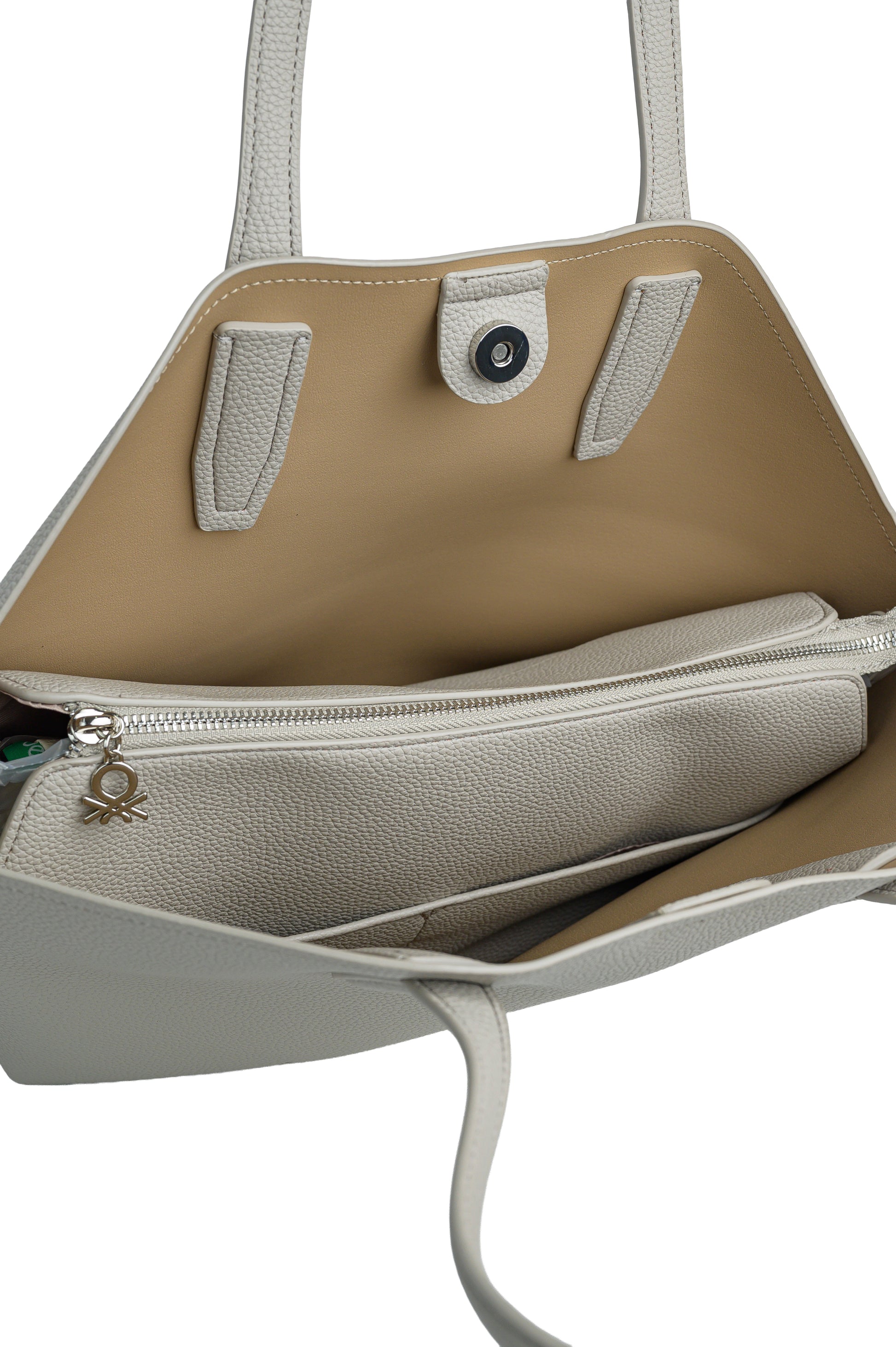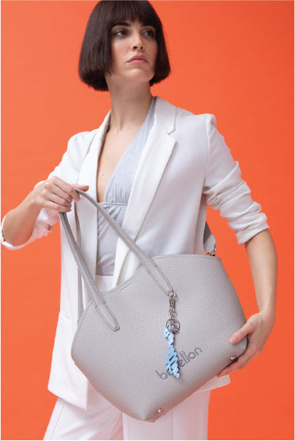 תיק אישה מדהים שכל אחת חייבת לעצמה! מבית המעצב האטלקי Benetton ,תיק בגודל בינוני מעוצב, עשוי חומר דמוי עור איכותי! התיק תפור בטקסטורה של עור חלק, לוגו המותג מוטבע על העור . לתיק יש רצועה דמוי עור לנשיאה ביד ובנוסף + רצועת בד תואמת ארוכה לנשיאה על הכתף . בתוך התיק יש ריצרץ מרכזי של התיק ובנוסף  התא עם הריצרץ יכול לצאת והתיק הופך לתיק שק גדול תא ריצרץ בפנים התיק לדברים חשובים וריצרץ קידמי. לתיק יש רצועה מתכווננת לגודל הרצוי + ידית נשיאה ביד, אחריות יבואן רשמי BRANDS4YOU