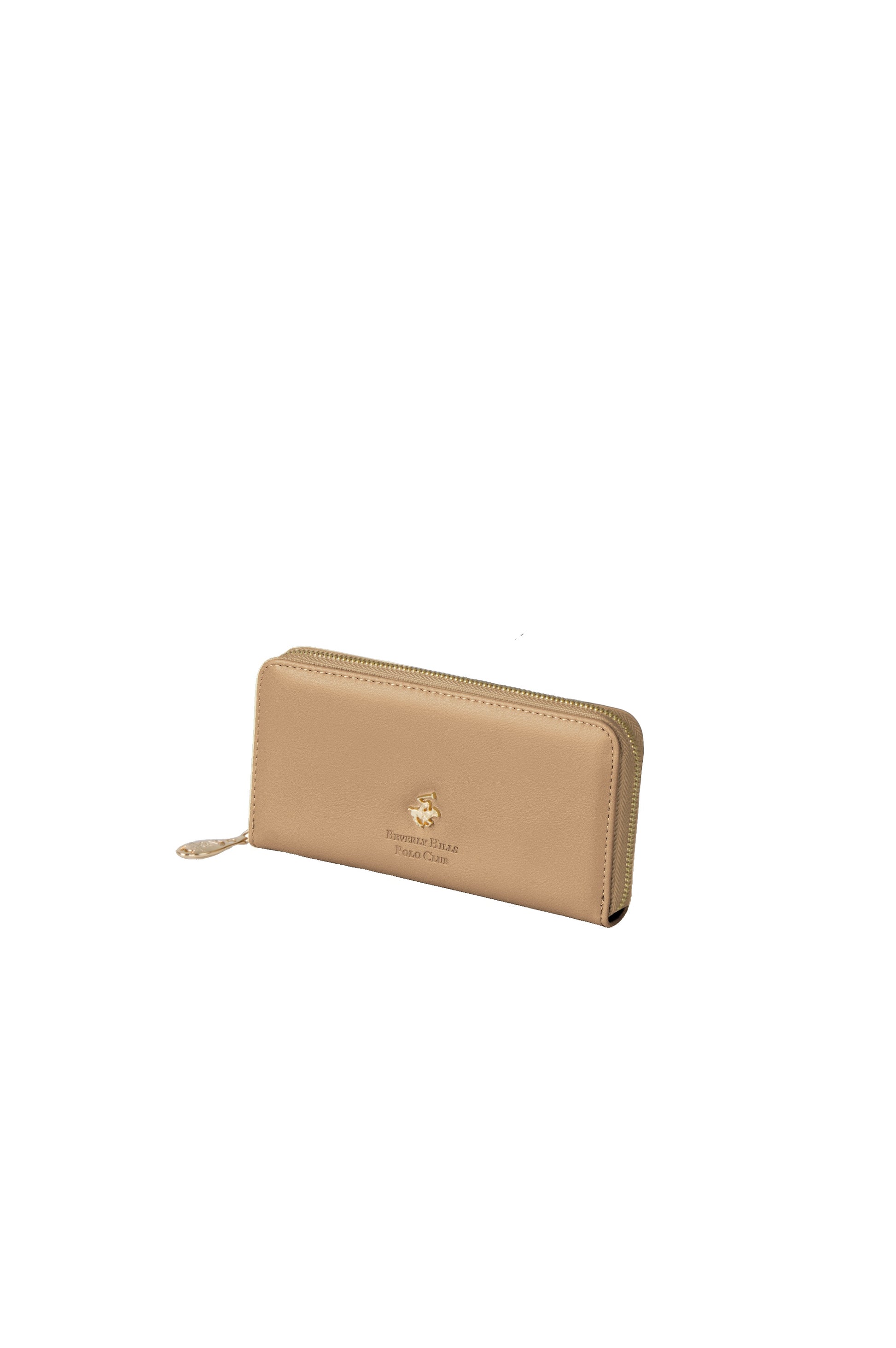 ארנק בגודל לארג' מבית POLO BEVERLY HILLS, עשוי פוליאוריתן במרקם מגורען בצבע בז עם לוגו מוטבע של הסוס. לארנק חריצים מיועדים לכרטיסים, בשילוב כיס במרכז למטבעות בסגירת ריצרץ. מגיע עם 9 מקום לכרטיסים, תא 1 לצקים, תא גדול למטבעות כפתור.ארנק מושלם ומאוד פרקטי. מידות : 10.5x19x2.5