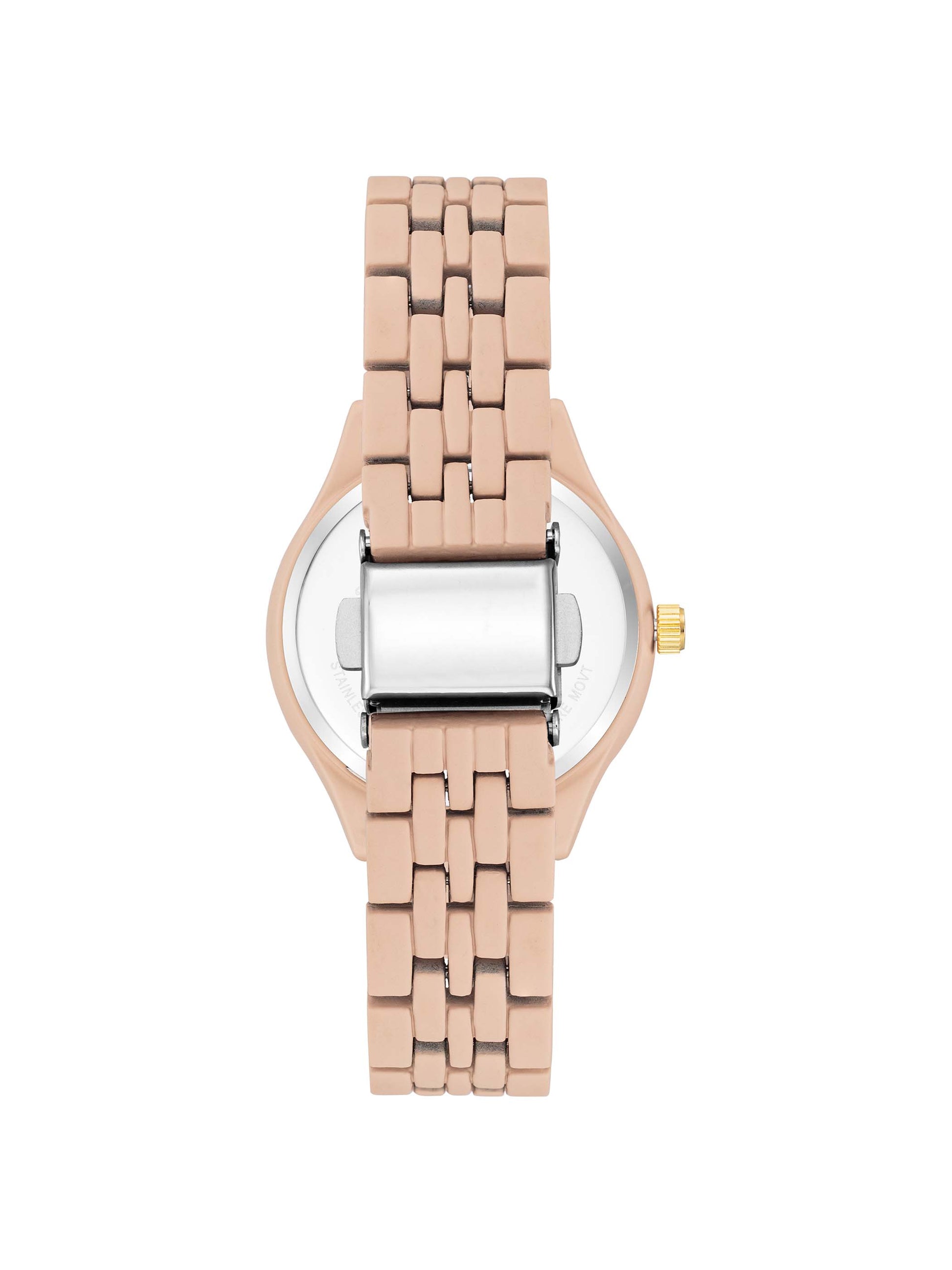שעון יד לאישה עשוי פלדה אל חלד עם ציפוי סילקון נעים בצבע קרם , עם לוח קרם ואבנים של המותג השעון מהמם, סגירת רצועה מאוד נוח וקל