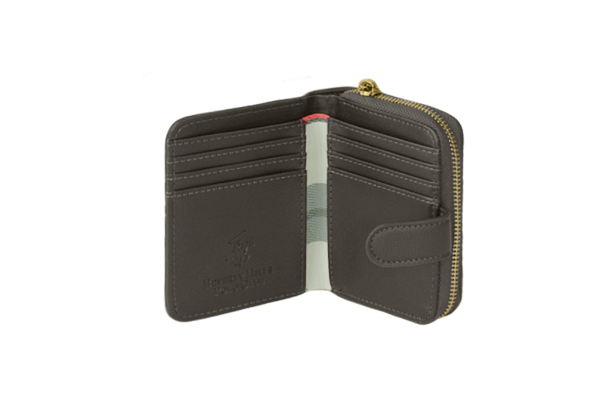 ארנק בגודל מדיום מבית POLO BEVERLY HILLS, עשוי פוליאוריתן במרקם מגורען בצבע חום כהה עם הטבעת לוגו . לארנק חריצים מיועדים לכרטיסים, בשילוב כיס במרכז למטבעות בסגירת כפתור. מגיע עם 12 מקום לכרטיסים, תא 1 לשטרות, תא גדול בגב הארנק למטבעות בנוסף יש לו סגירה של הארנק עם כפתור. ארנק מושלם ומאוד פרקטי. מידות : 10.2x12x2.5